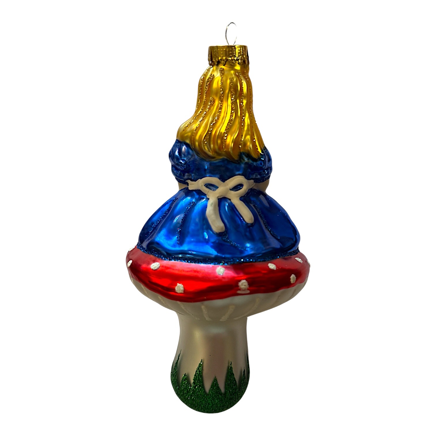 Alice in Wonderland in the Christmas tree!  Straight from the pages of a beloved fairytale: Alice sits dreamily atop a red-and-white toadstool, just like in Alice in Wonderland. With her iconic blue dress and blonde hair, she’s instantly recognisable. This ornament captures the charm and surreal wonder of the story – perfect for lovers of whimsical or storybook-inspired Christmas décor.