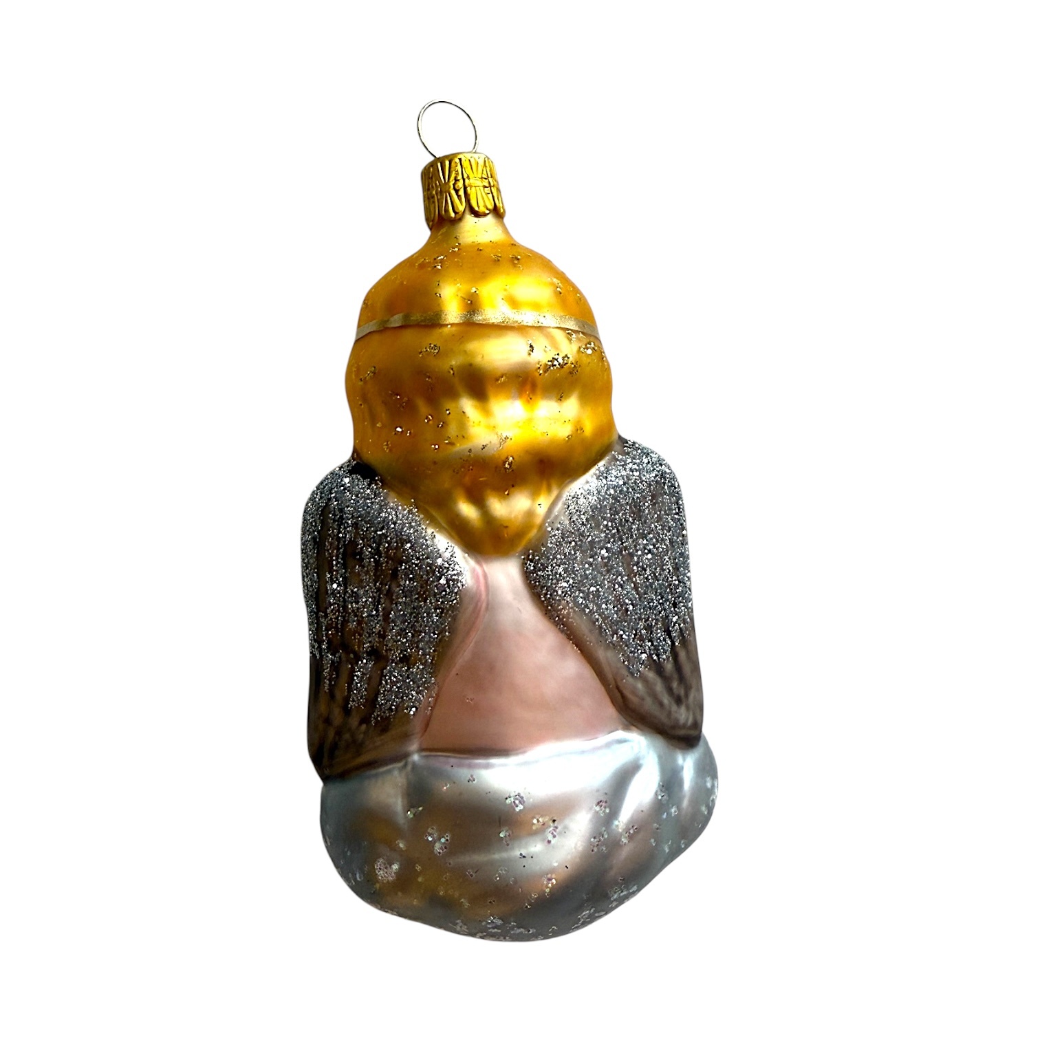 This angel, resting its cheek gently on one hand, seems straight out of a painting by Raphael or Titian. The contemplating angel on a cloud – gazing thoughtfully at the world below – is a timeless Christmas theme, often seen in angel-themed baubles. Its delicate star-topped tiara and shimmering silver wings give this ornament a peaceful, poetic presence. A gentle symbol of wonder, reflection and serenity.