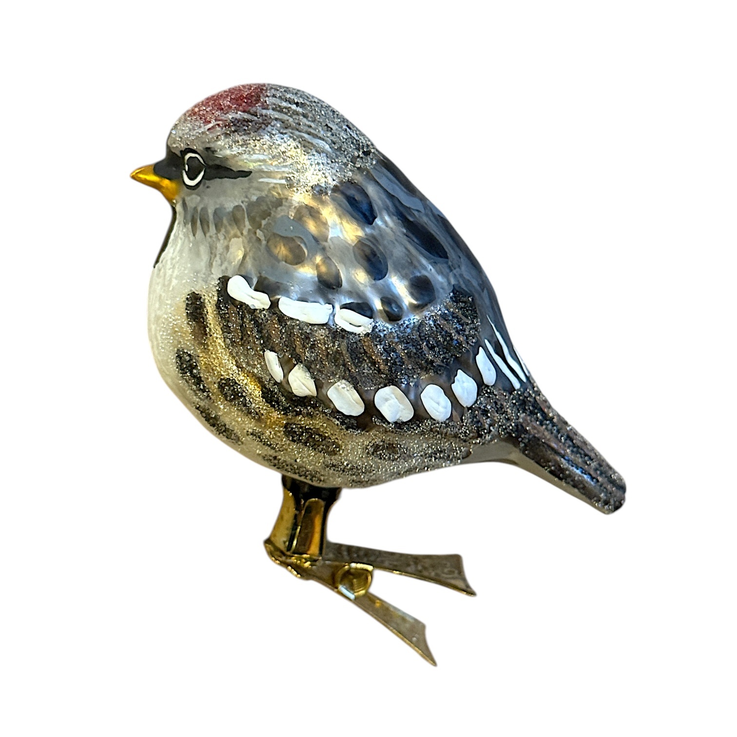 Birds are symbols of happiness and joy, so they are regarded as a necessity on the Christmas tree. A delicately crafted Christmas ornament in the shape of a redpoll – a small, hardy songbird found throughout Northern and Central Europe. With its soft grey wings, white breast, and distinctive red crown, this ornament captures the quiet charm of winter wildlife.