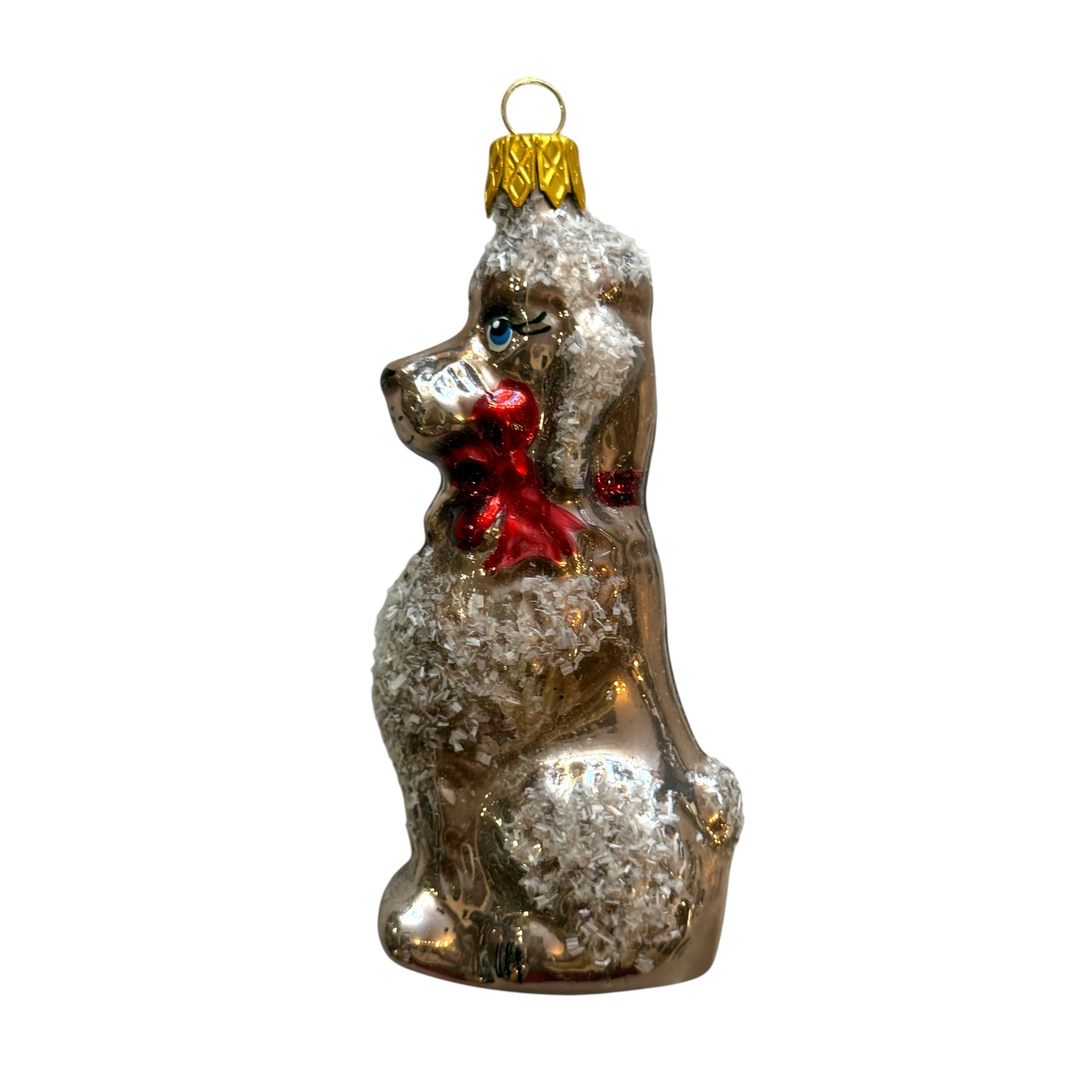 Christmas ornament shaped like an elegant taupe-colored poodle, featuring a glossy textured coat, snowy highlights, and a red bow. The refined posture and gentle facial expression make this piece a charming addition to any Christmas tree.