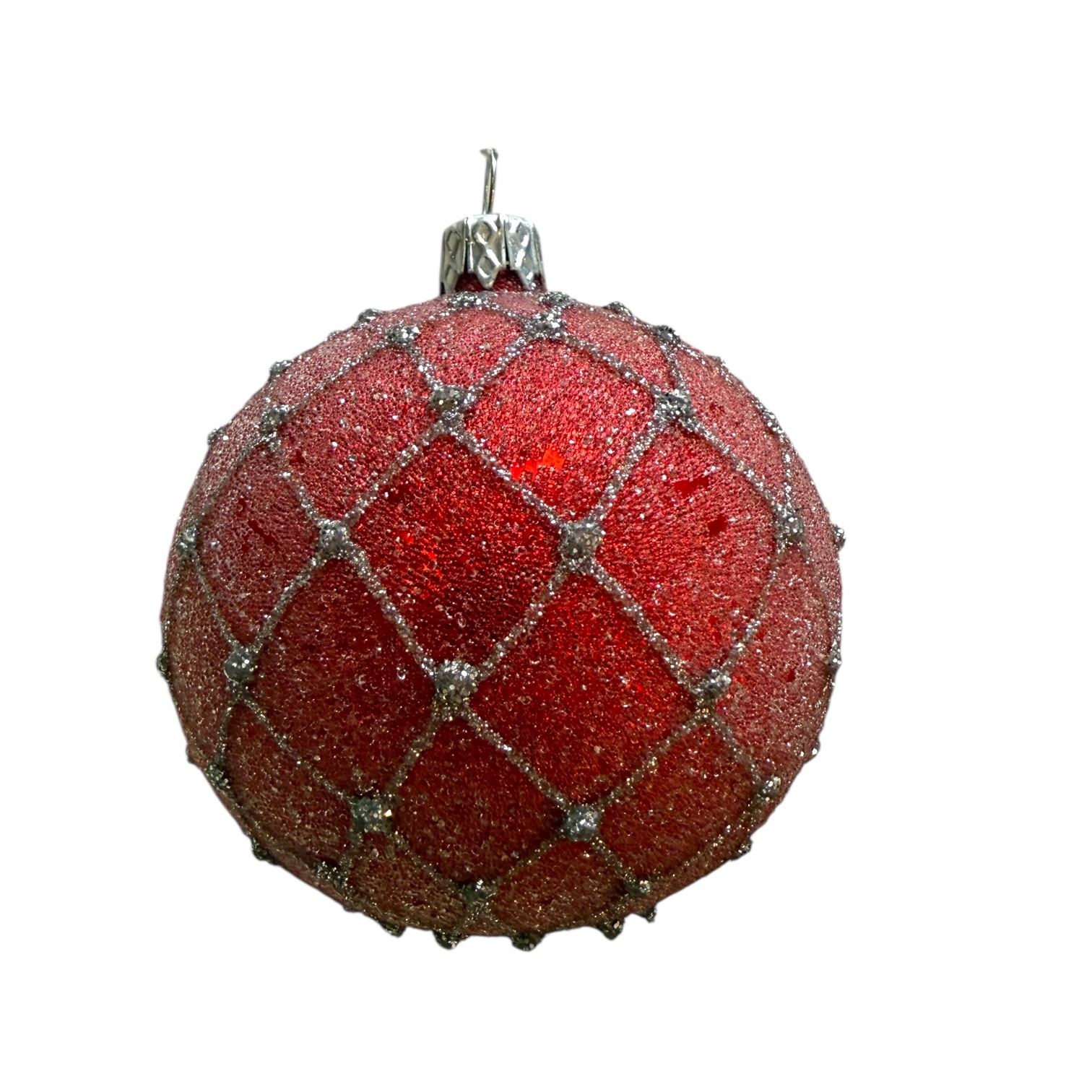 Een stijlvolle kerstbal met een klassieke uitstraling en een verfijnd decoratief patroon. Deze matrode kerstbal is versierd met een zilveren trellisstructuur die als een sierlijk netwerk over het oppervlak ligt. Op elk kruispunt fonkelen kleine transparante pareltjes die een subtiele shimmer geven zodra ze het licht vangen.