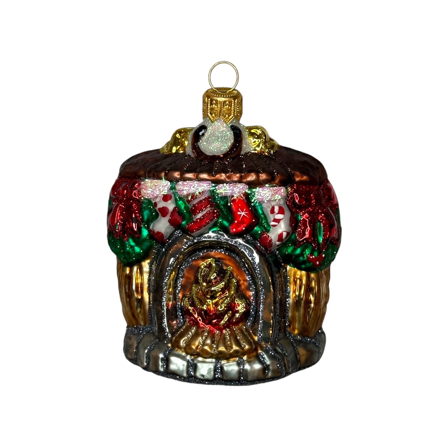 Open haard kerstbal. Kerstversieringen van prachtig dik en kleurrijk glas, met de hand beschilderd.