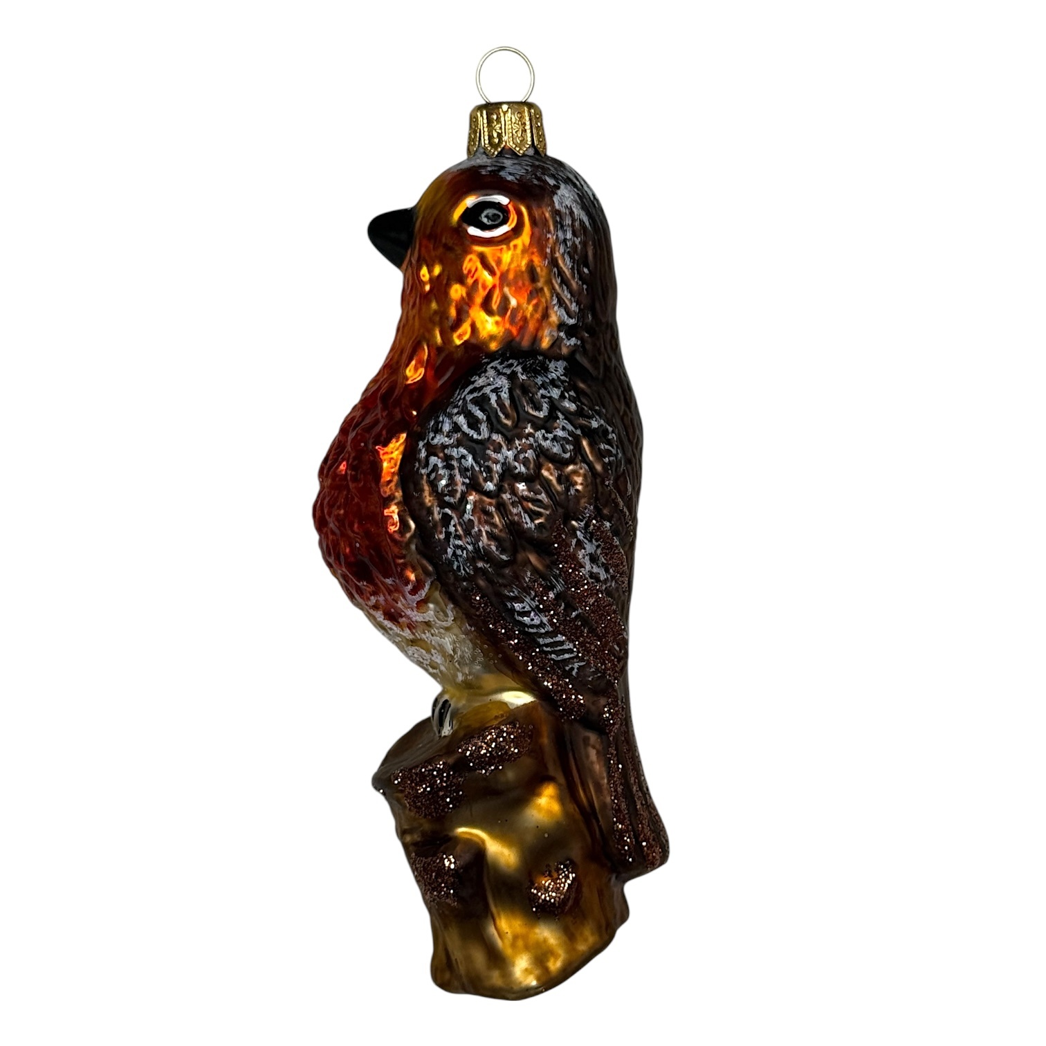 Roodborstje kerstbal. Kerstversieringen van prachtig dik en kleurrijk glas, met de hand beschilderd.