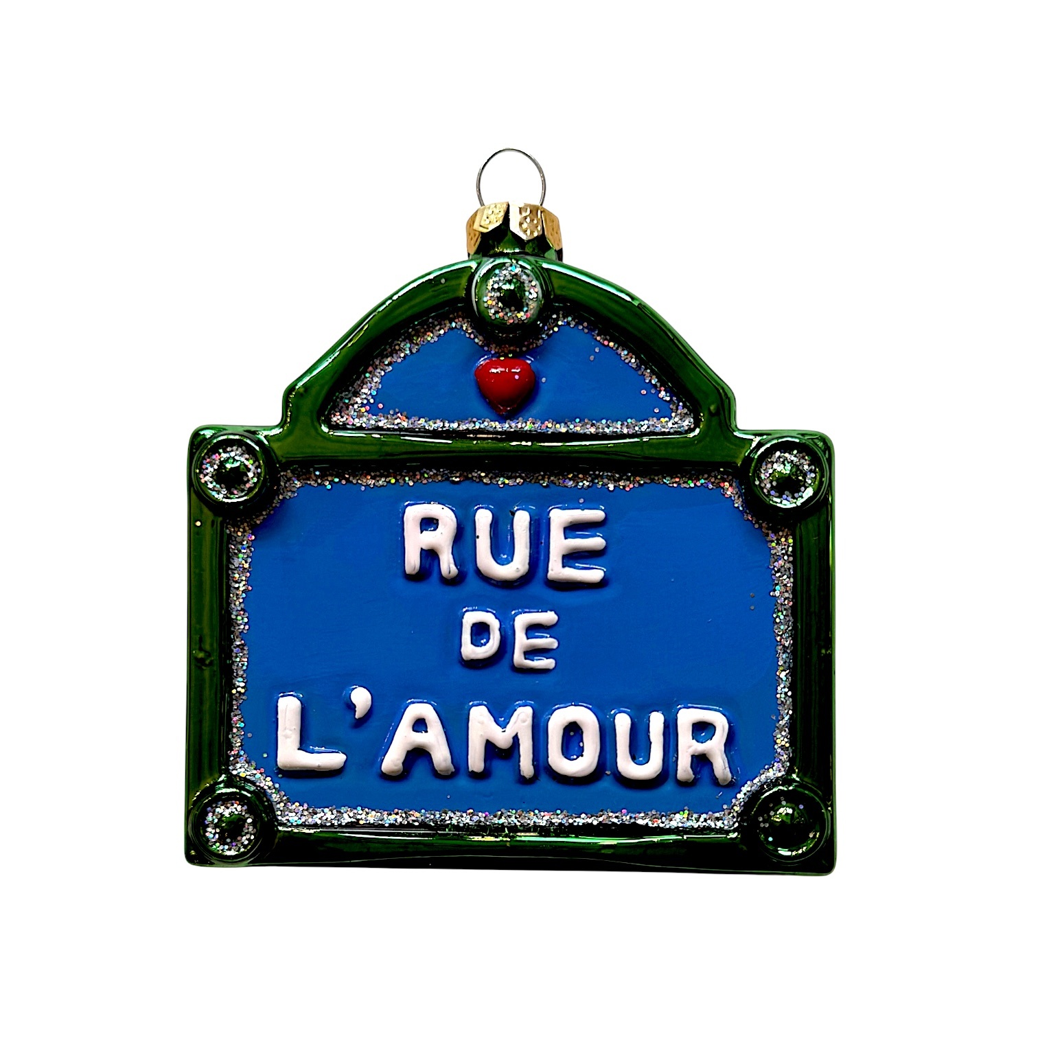 Een romantische straatnaam in Parijse stijl. Rue de l’Amour ("Straat van de Liefde") spreekt tot de verbeelding. Dit ornament toont een nostalgisch straatnaambordje met sierlijke letters, in blauw, wit en groen. Subtiele glitters geven de bal extra charme. Een prachtige keuze voor wie houdt van Parijs, liefde, Franse details of symboliek. Combineert mooi met andere stadse ornamenten, vintage huisjes of een boom vol hartvormen.