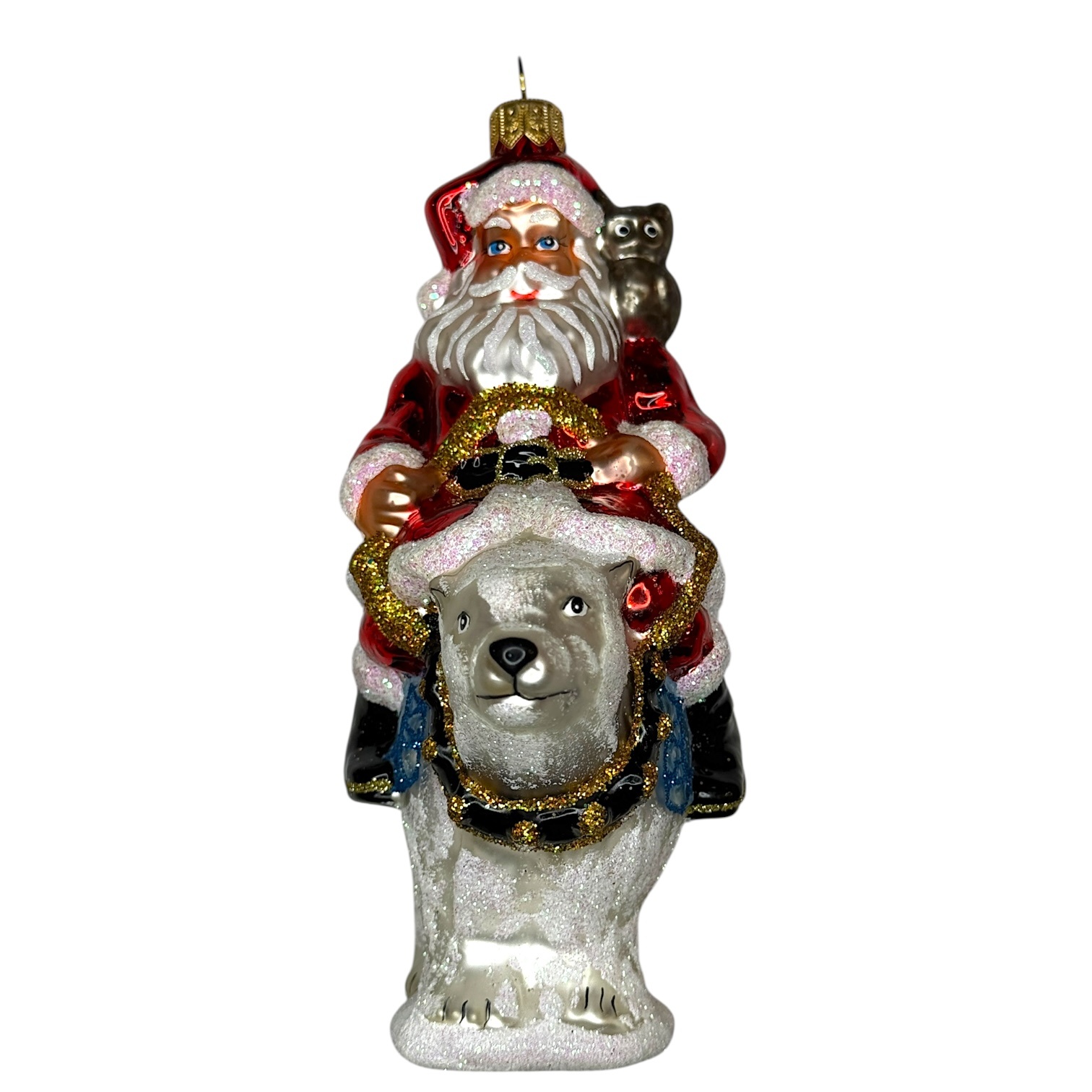 Een betoverend winters tafereel: de Kerstman die stoer zit op de rug van een machtige ijsbeer. Deze kerstbal combineert fantasie en traditie met een knipoog – want waarom zou de kerstman altijd met een slee reizen? De ijsbeer is gedetailleerd uitgewerkt met een zachte witte glans, terwijl Santa in zijn rode mantel straalt van vreugde. Een geliefd ornament voor wie houdt van dieren, sneeuw en een beetje kerstmagie.