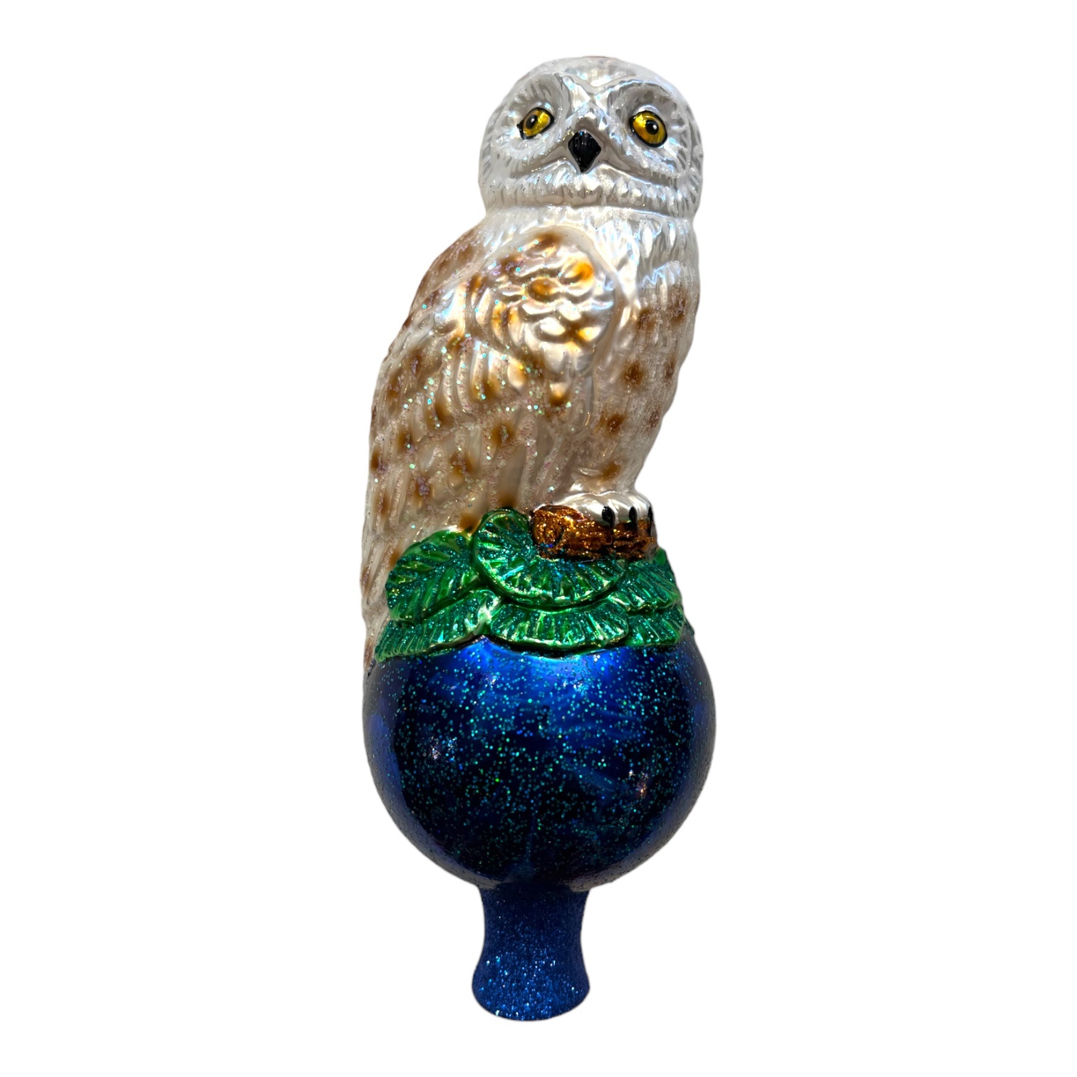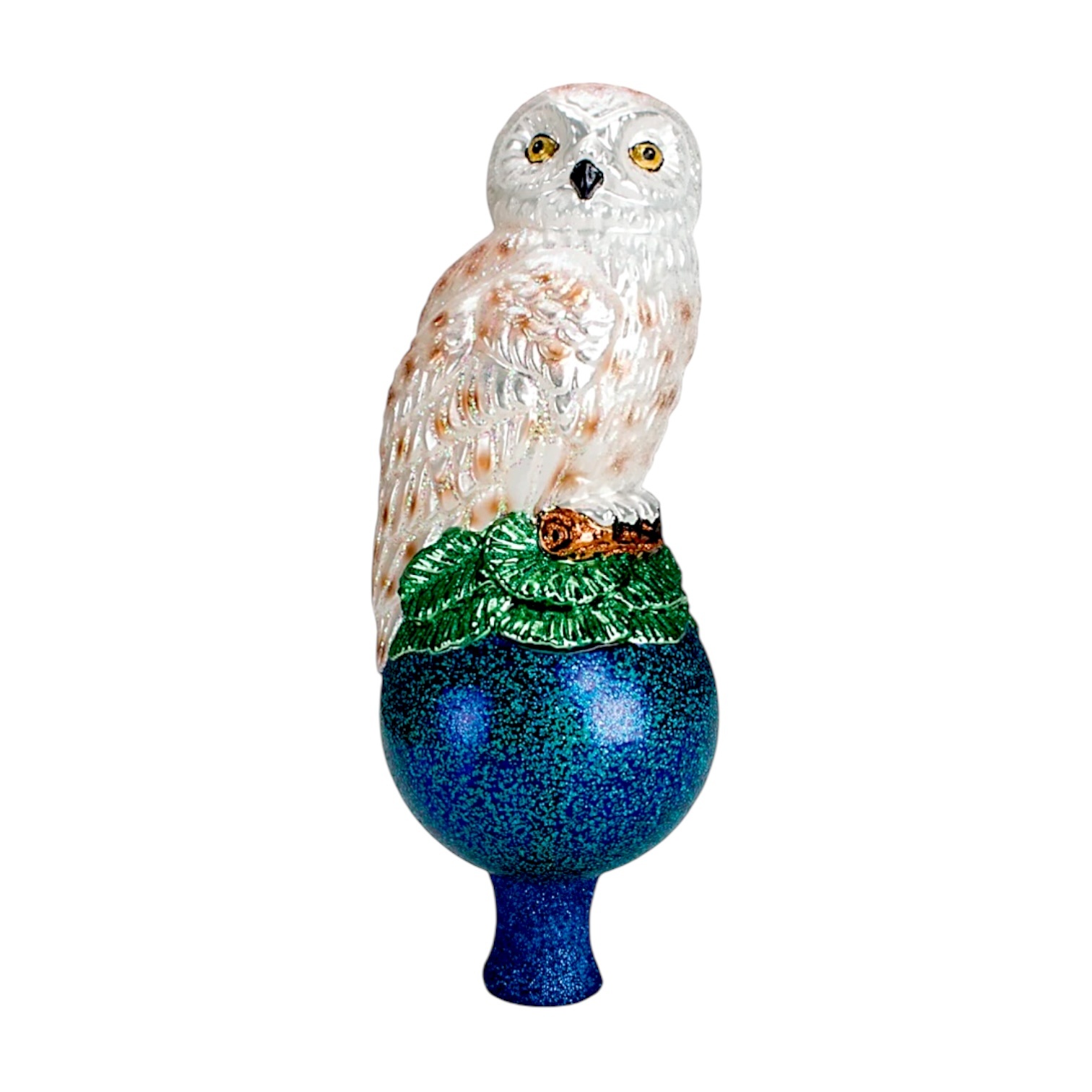 Een wijze uil in de top van de kerstboom. Een majestueuze kerstpiek in de vorm van een witte uil – zittend rechtop, met doordringende ogen en een kalme, wijze uitstraling. Deze prachtige uil, vaak symbool voor inzicht en kennis, waakt als stille beschermer over de boom. Zijn vacht is gedecoreerd met zachte glitters en subtiele zilveraccenten, waardoor hij schittert in het licht van de kerstverlichting. Een betoverende piek die elegantie en symboliek verenigt.